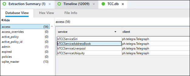 Once you got to the database you could find the answer. If you looked up Telegram prior to diving into the database, you knew the name of the app is ph.telegra.Telegraph. kTCCServiceLiverpool is used for location and Ubiquity is used for iCloud.