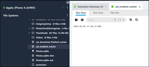 What we were looking for here was the cpl_enabled_marker file. This file notes when iCloud Photos was turned on. The file is located at /private/var/mobile/Media/PhotoData/cpl_enabled_marker. You did need to tweak the time to reflect the requested time format.