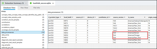 If you look at the healthdb_secure.sqlite (remember you need an encrypted backup or a Full File System to get this file), there is a table data_provenances that lists each version of the device and related time zone.