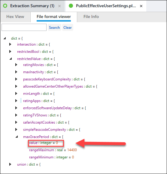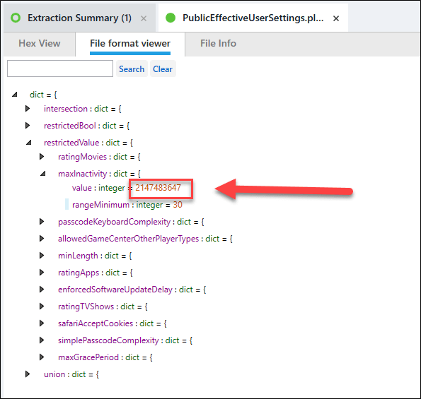 Upon reviewing the plist file, you can see the MaxInactivity value is 2147483647 which means the phone never auto-locks.