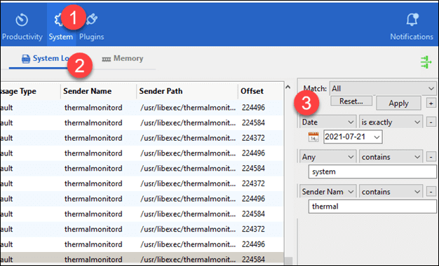 I changed the filter to 2021-07-21 and looked for 00:06, which will be the correct time in UTC. I also filtered for the word ‘system’ and reviewed the results.