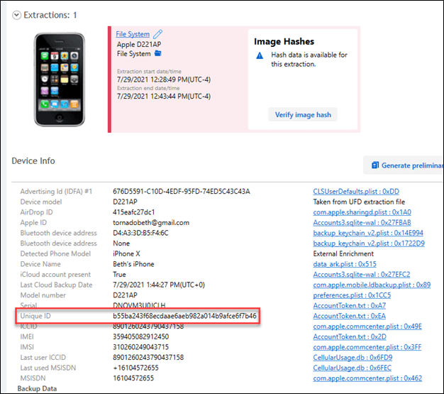 First, you will need to know what you are looking for, so we’ll go to the extraction summary, and note down the Unique ID of the phone.