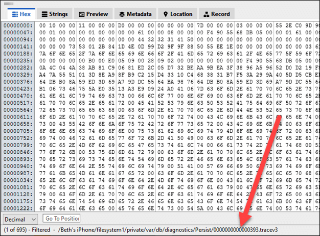 From there, you can see the message was “System will Power On” and the file storing it is /Beth’s iPhone/filesystem1/private/var/db/diagnostics/Persist/0000000000000393.tracev3.