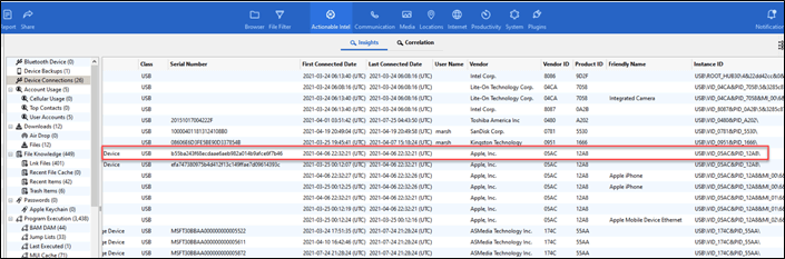 Once you have this, we need to go over to Marsha’s PC extraction. Here in Digital Inspector, you can easily look up Device Connections and find the Unique ID of the phone and the time if was connected.