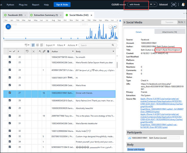 The easiest way to get to this one, was to search for ‘with friend’. This will bring you to a Facebook ‘Check in’ where Beth checked-in at “Amani’s BYOB Downingtown.”