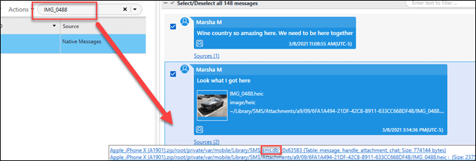 Sharing of pictures can occur in various ways. Since we know the image we are looking for, and we know it was shared, starting off in the Chats, and searching for the image, we can see that it came from Marsha. There are two source files listed, and one was your answer.