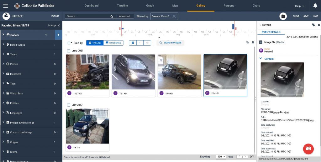 For example, Cellebrite Pathfinder can automatically analyze and consolidate media files into 35 different categories, such as Drugs, Money, or custom categories created by a user.
