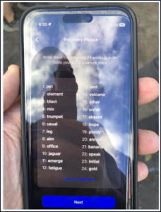 Signal uses MobileCoin (MOB) for in-app payments, which is a cryptocurrency. Part of the setup process involves setting up a recovery phrase. Here, Abe documented the phrase by taking a picture and attaching it to a Note. To find it, search “signal mob” to surface the note. Then open the attached picture.