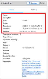 The timestamp in the Biome is in UTC, so we still need to determine where Abe’s phone was on June 16th. Ultra’s Location tab comes in handy here. Under the Visited section of the Locations tab is “Places.” Filtering the timestamp column for June 15th and June 16th finds that Abe’s phone was in Atlanta, GA in the United States when the alarm notification occurred. At that time of year, the time zone offset was UTC -0400, which means the alarm occurred on 2023-06-16 at 06:00:00 UTC -0400.