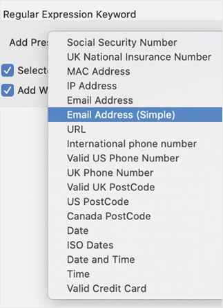 To add a RegEx preset to a keyword search, on the lower right side of the ‘Content Pane’ select the Add Preset drop-down menu. For this example, select the Email Address (Simple) menu option.
