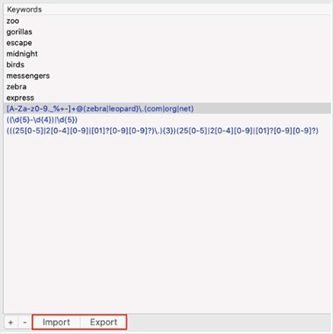 To share customized RegEx patterns with other case investigators, select the bottom of the list select the Export button. BlackLight exports all of the keywords in the list, including any the regular expressions, as a plain text file. To import a custom keyword list into case, a list that may include regular expressions, select the Import button. Navigate to and select any plain text file containing line-separated keywords and regular expressions.