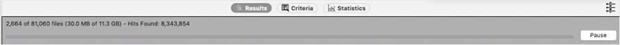 If the test data is not large enough, or does not provide enough variation, it may not illustrate when a regular expression is too vague. Vague regular expressions are expressions that hit on the desired data but are written so poorly they hit on a tremendous number of false positives. If when running a Content Search using a RegEx the number of hits grows rapidly, click the Pause button in the ‘Content Pane’ (the search must be selected in the ‘Component List’ to see the results as the search is running). In the example below, 8,343,854 hits were located in 30 MB out of 11.3 GB. This is a large number of hits in a small percentage of the data.