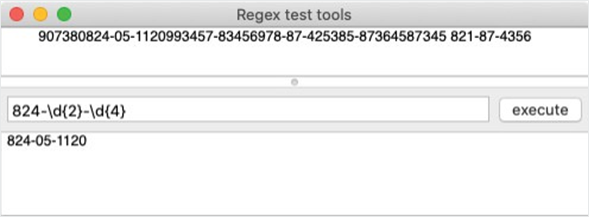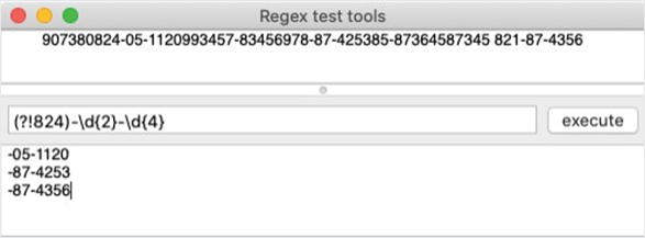 The Social Security pattern beginning with 824 is returned as a search hit even though we included the (?!824) negative look ahead because without the \d{3} it only looks for the second and third part of the Social Security number pattern.