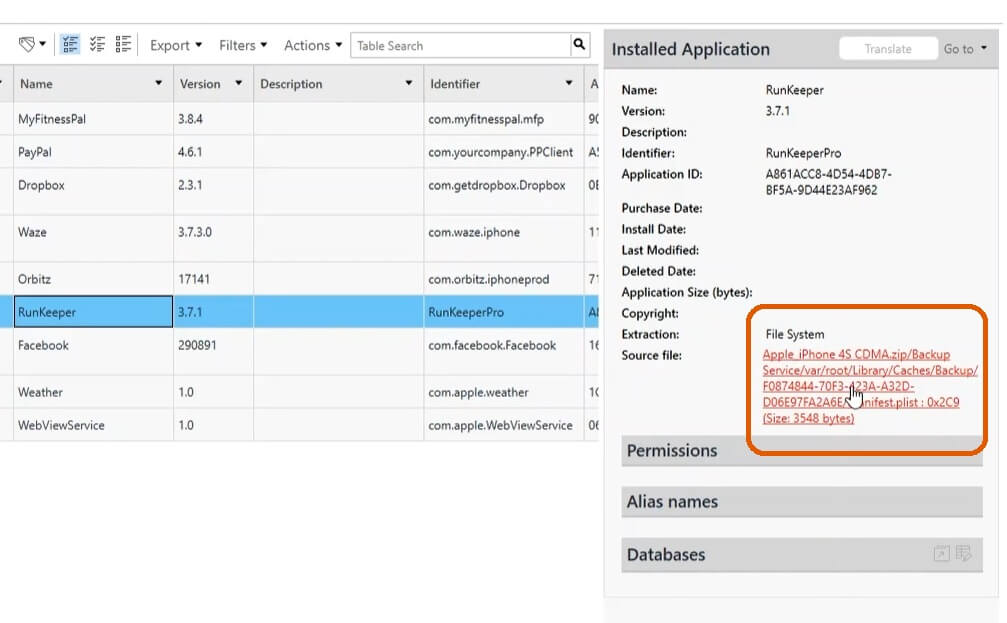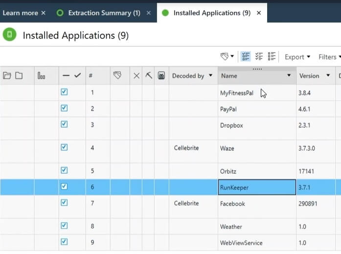 Without your feedback (requesting certain apps for Cellebrite to parse), parsing is going to be limited to the most popular and important applications. When we look closely at the example below, we see some fitness applications. We have “MyFitnessPal” and something called “RunKeeper” on the device.