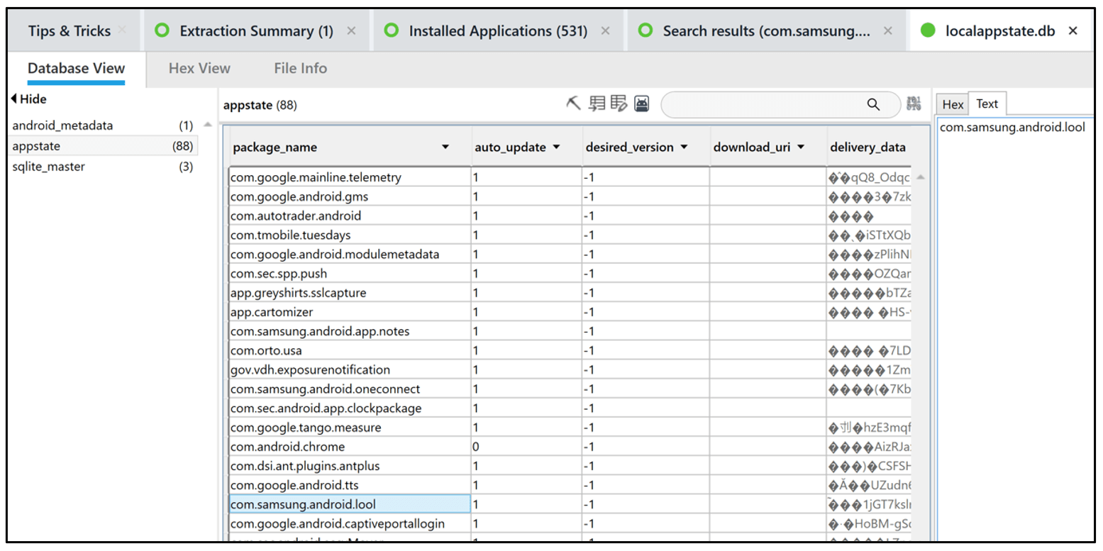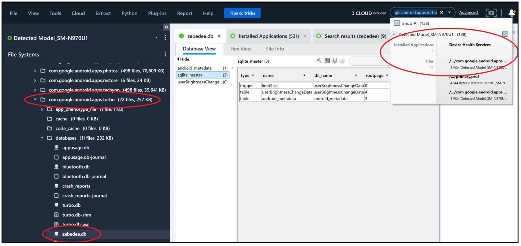 In Physical Analyzer, you can simply keyword search for “zebedee.db” or you can go to Databases in Analyzed Data and filter on Zebedee. Both options will lead you to com.google.android.apps.turbo. Kevin Pagano released an informative blog on the importance of this file, and we recommend you read it! (https://www.stark4n6.com/2020/12/charging-battery-with-turbo-db.html) Once you have the package name, return to the Installed Applications and you will find the app is associated with device health.