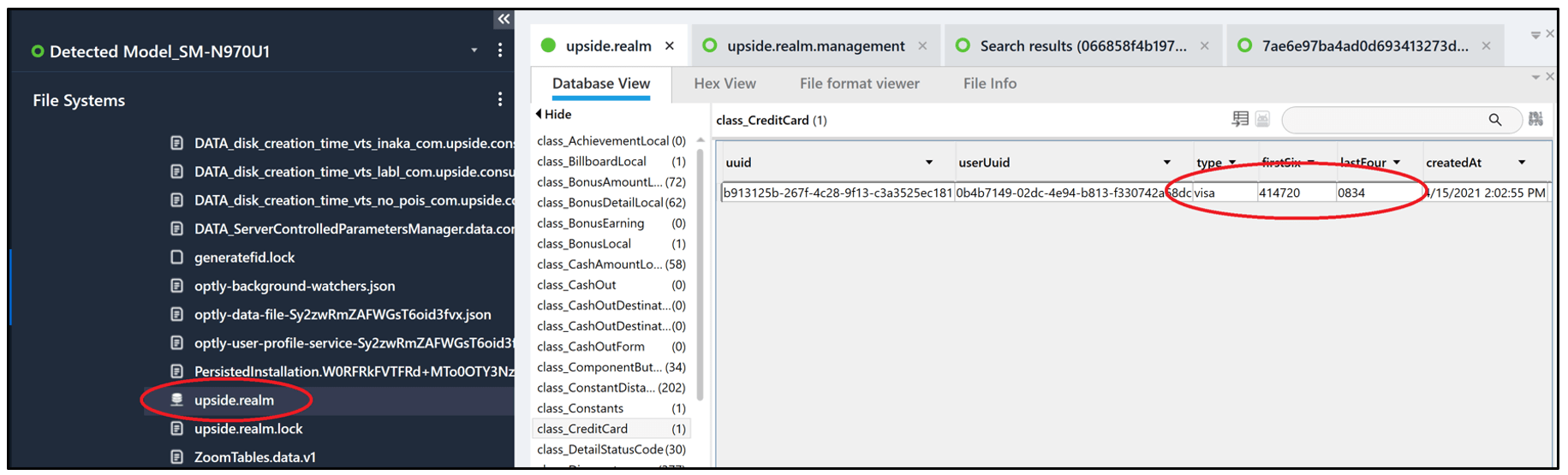 In Physical Analyzer, a great starting point is installed apps. From here, search for anything that is associated with purchasing or “gas.” This will lead you to the database upside.realm. Inside class_CreditCard was a visa card with details first 6 = 414720 last 4 = 0834.