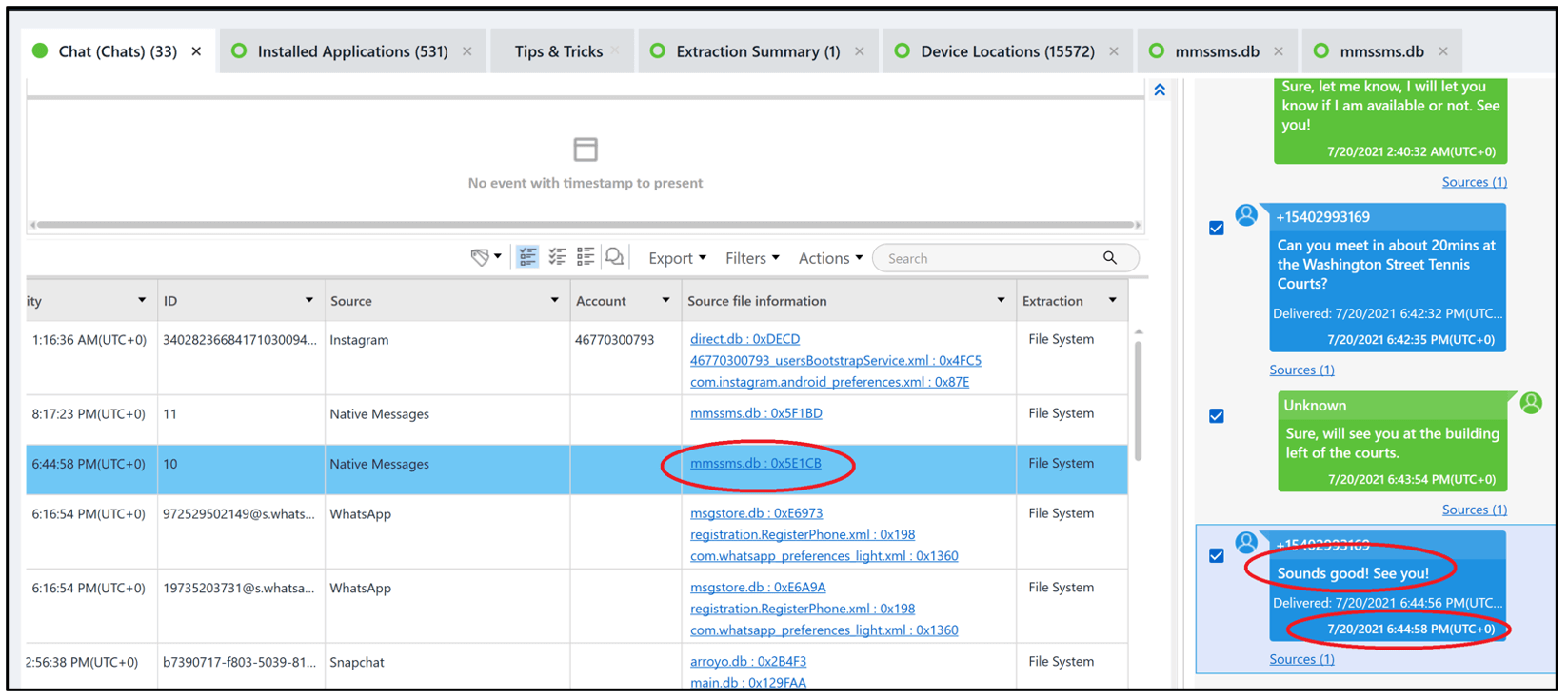 The best starting point for this one is to examine the messages on the device. Below, we can see Physical Analyzer and how the mmssms.db renders the chats. On the far right, we see the number, timestamp, and location.