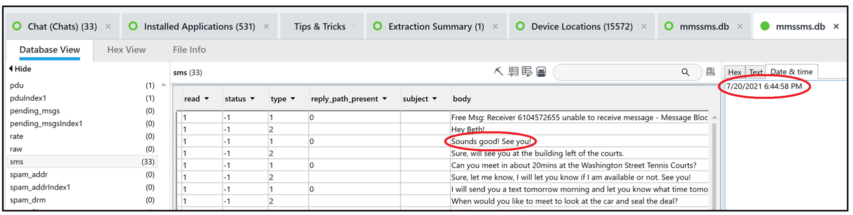 Another option is to go directly to the mmssms.db and search for “Meet”. This method will also provide the answer and the Date&Time tab in the SQLite Viewer in PA can be used to decode the timestamp.