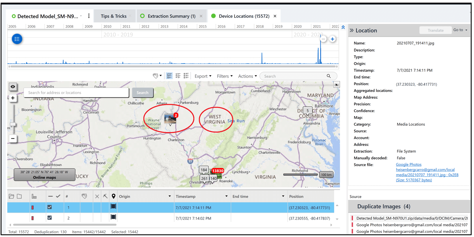 A quick triage will allow you to quickly answer this. We looked at Location data and saw photos associated with West Virginia.