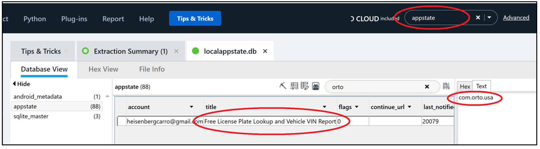 Again, starting with Installed applications and looking at the type of application may help. One should stand out and that is com.orto.usa. Another way is to filter or search for “license” which will lead you to the application. Localappstate.db will also provide this answer, as will ALEAPP.