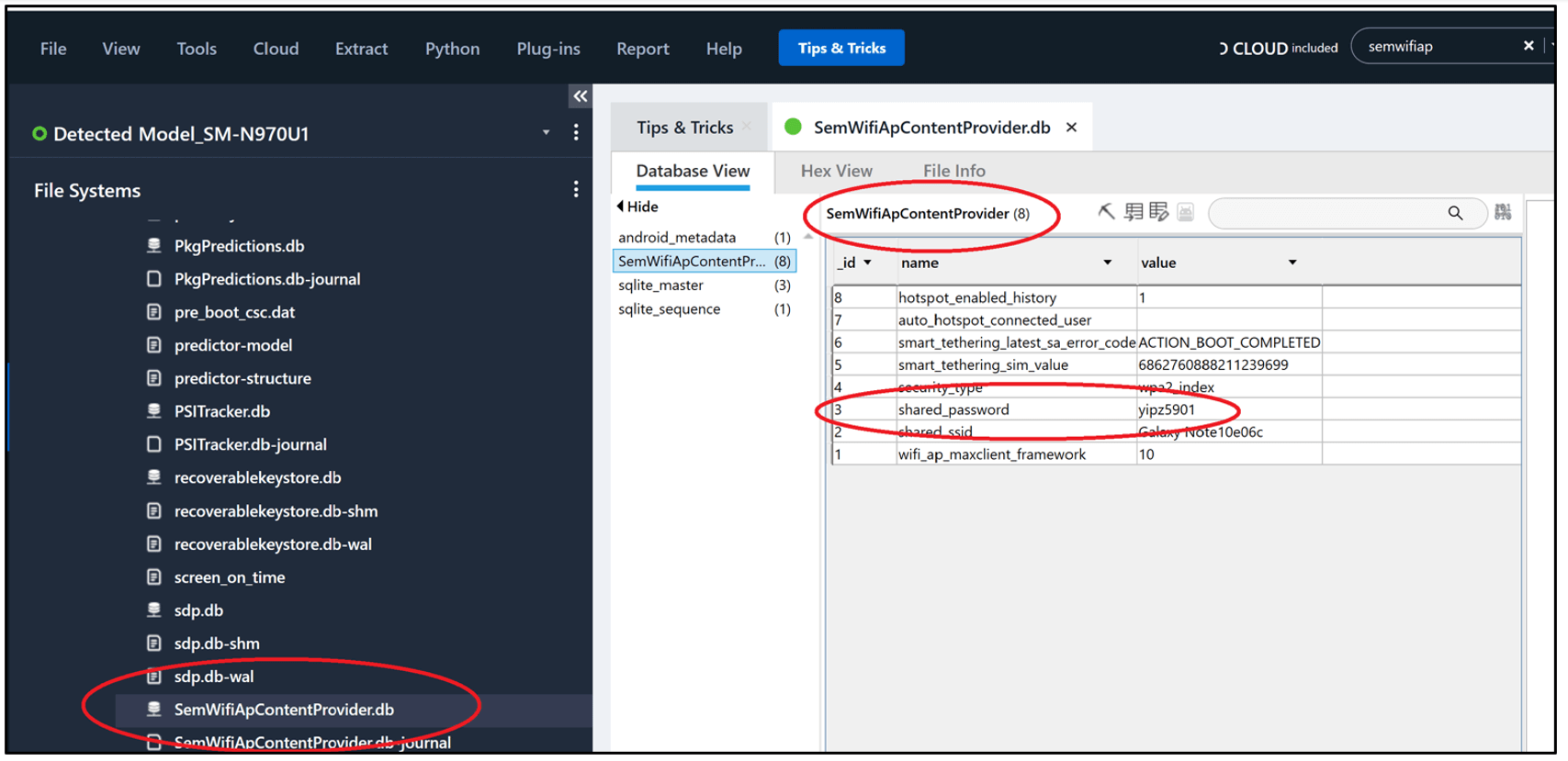 Keyword searching is helpful for this question. If you search for “wifi” you will find SemWifiApContentProvider.db. The table SemWifiApContentProvider has a field with “shared_password” which is shown below.