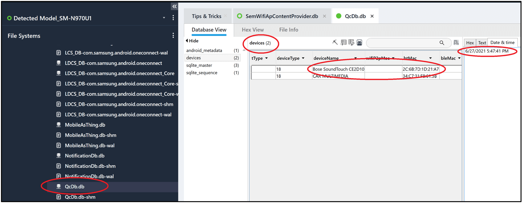 Bluetooth Timestamps are tricky. You need to make sure you understand the meaning of them. As always, I want to dig deeper and validate so I searched in Hex for “CE2D10” and ultimately found QcDb.db where a record shows the timestamp. This timestamp is in UNIX Milliseconds.