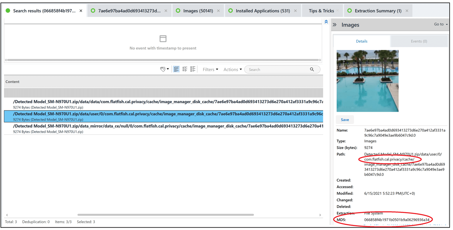 One approach is to search for the hash value in Physical Analyzer. Another is to go into Analyzed Data>Images and filter on hash value. Either way, you will be led to the package name (com.flatfish.cal.privacy ) within the file path.