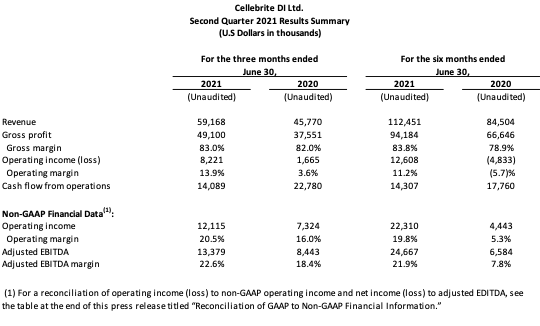 “Cellebrite continued to perform strongly in the second quarter of 2021, with revenue growth and profitability exceeding our expectations once again,” said Yossi Carmil, Cellebrite’s CEO. “These results reflect successful execution of our go-to-market strategy, and strong and sustained customer demand for our Digital Intelligence solutions designed to help them transform and accelerate the investigative workflow while protecting lives and preserving privacy. We are seeing a healthy market environment, which reflects an inflection point, with law enforcement agencies increasingly realizing that digital transformation is a necessity given the rapid growth in digital data volumes, complexity and importance. We continue to expect our merger with TWC Tech Holdings II Corp. will be completed in the third quarter of the year, and we look forward to continuing our journey as a public company.”