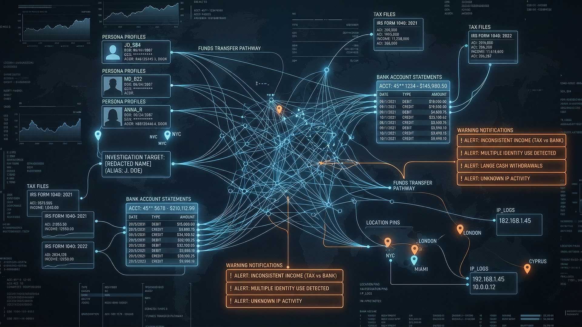 Fourteen accounts at different banks. All opened with stolen identities. All designed to look completely unrelated. But when investigators analyse the digital fingerprints behind the applications, connections emerge with shared IP addresses, matching device identifiers, email patterns that were never meant to be found.
